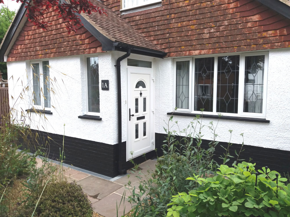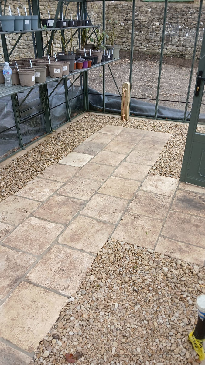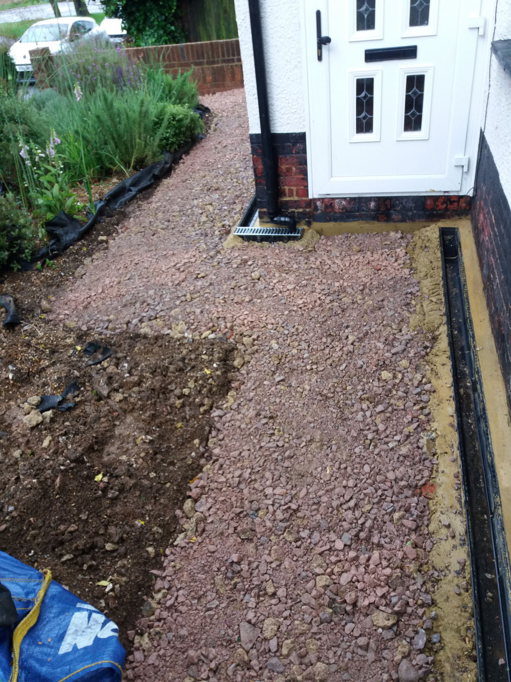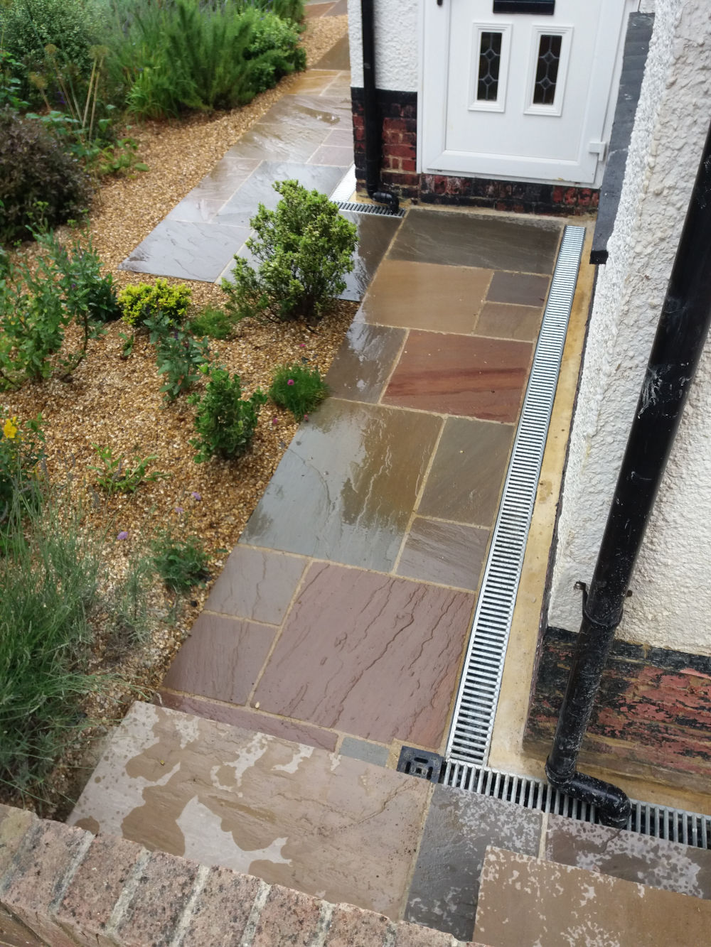 This project involved new underground soakaway cages, drain pipes, channel drains and new sandstone paving paths around the house.