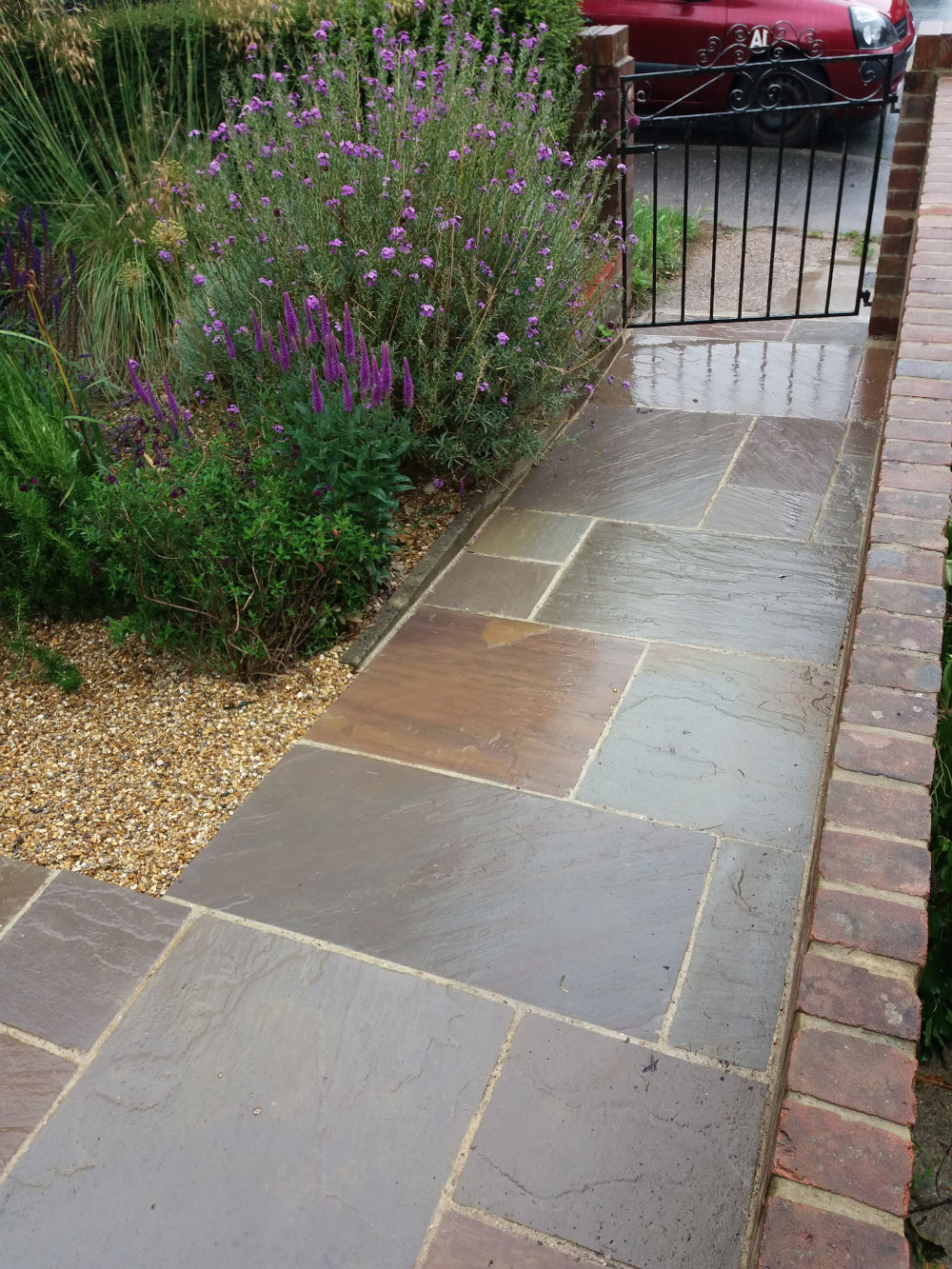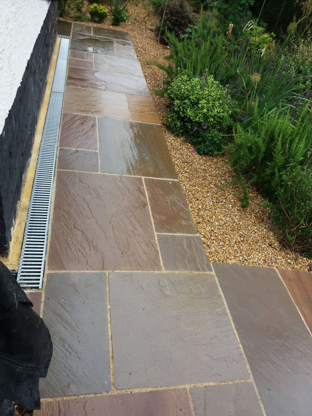 This project involved new underground soakaway cages, drain pipes, channel drains and new sandstone paving paths around the house.